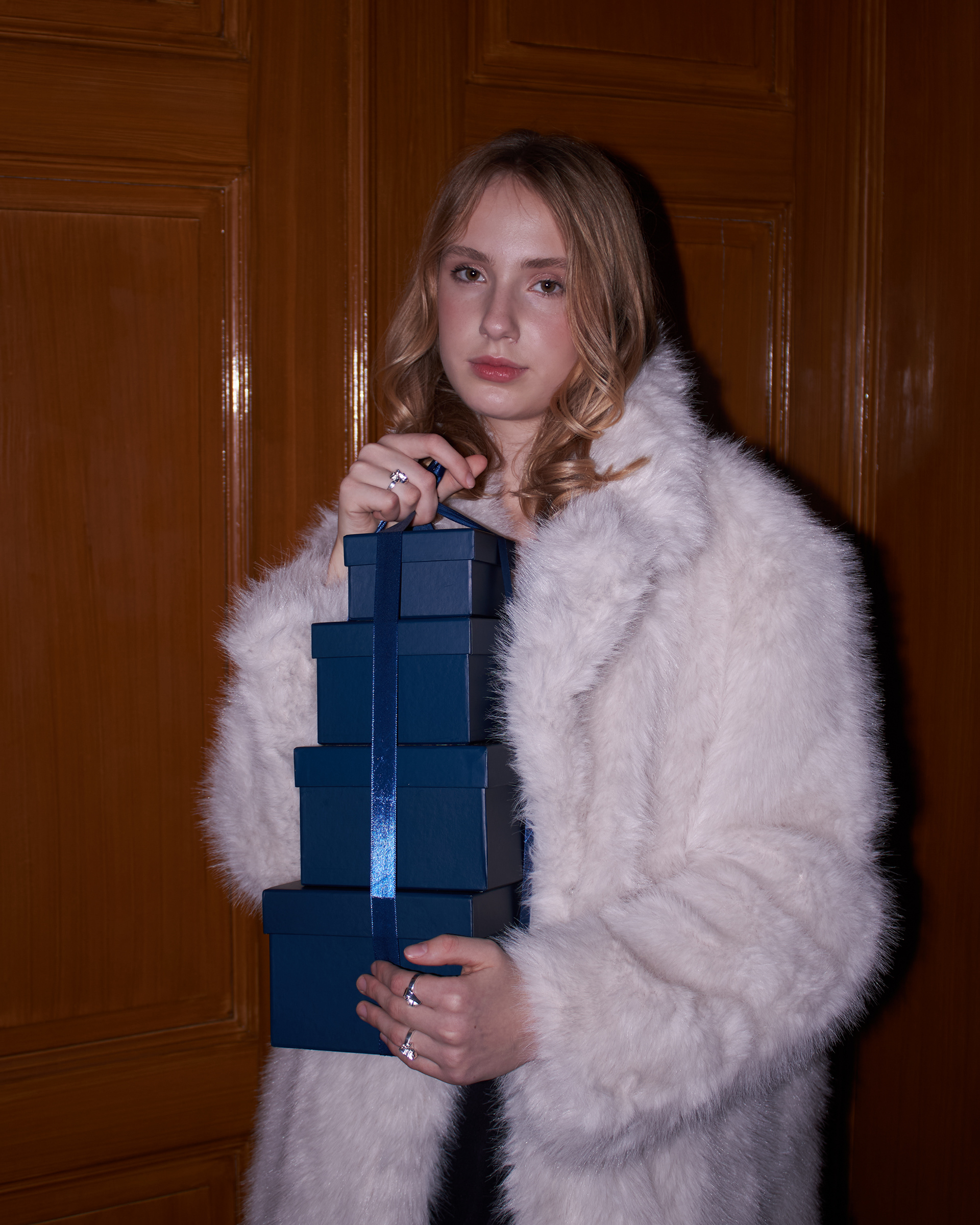 Shooting for the jewelry brand Little Blue Door during the winter and Christmas season, the creative concept was inspired by small gestures of warmth that brighten the coldest time of the year. The story follows a young woman as she moves through quiet winter streets with a paper bag tucked under her arm, filled with freshly baked cookies that are still warm from the oven.